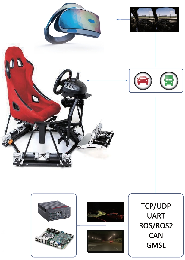 透過內建車輛動態數學模型,利用動態提示技術,於六軸動態平台上呈現駕駛體感,同時透過與先進渲染引擎整合,利用即時光線追蹤技術,呈現高擬真駕駛畫面與虛擬實境沉浸式體驗。 實際的駕駛環境可以提供駕駛者一個安全且有效的駕駛訓練環境,可以根據常見的道路狀況,設計情節,考驗駕駛人的駕駛技巧與安全駕駛能力。 本測試平台可以拓展與自動駕駛、輔助駕駛系統整合,透過實體通訊介面建置,可以使用常見的車用通訊介面(如:CAN),並與自動駕駛常見的開發環境介面(如:ROS)整合,可以體現自動駕駛、輔助駕駛系統駕駛的車輛動態,協助開發者在早期調整控制器的舒適度與合理性。 結合自動駕駛、輔助駕駛系統,本測試平台也可以考量駕駛人的駕駛命令,進行 Driver in-the-loop測試,考驗駕駛人與自動駕駛、輔助駕駛系統互動之影響。 |