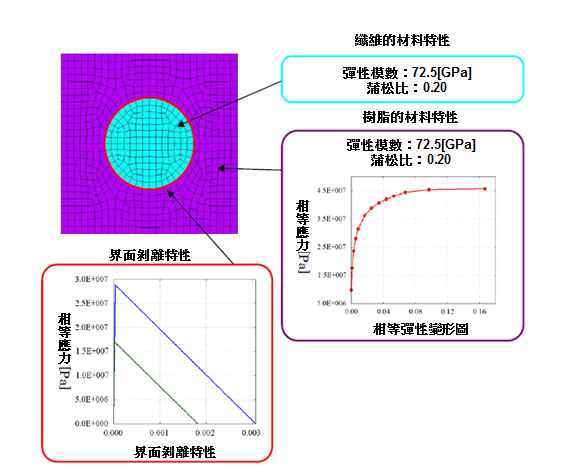 纖維定義為彈性材料,樹脂定義為彈塑性材料,纖維與樹脂界面定義界面剝離特性。