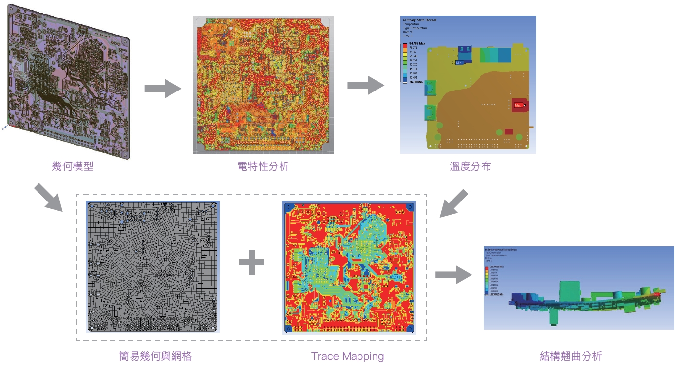 現象。 由於 PCB 複雜的線路設計和疊層會造成網格上的負擔,Ansys Mechanical 利用幾何的簡化和複雜線路的 Mapping匯入方式,提升分析效率。實現 PCB 與其 Trace 經過熱形變的結果,讓使用者了解可能的板彎和應力集中的位置,並提供更實際的解決方案。