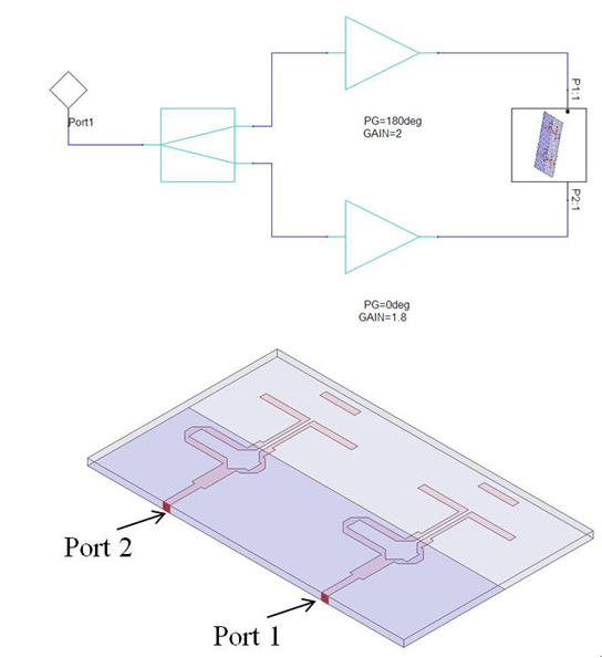 在印刷式陣列天線組裝包括分配器、放大器在內的饋入電路,可以在顧及饋入特性下,解析天線幅射特性與增益。