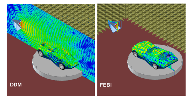 尋求解決方案時,空氣盒內部用業界標準的Golden-FEM演算法精確求解,盒子表面場為IE演算法,讓電磁場直接飛躍盒子間的無限空間,耦合到另個盒子表面,再扭動兩下即能鑽入。這個方法適用於遠距離多物體輻射分析。再比如雙站RCS,飛機和兩個雷達相距幾十公里甚至上百公里,用這個方法就可以輕鬆完成。