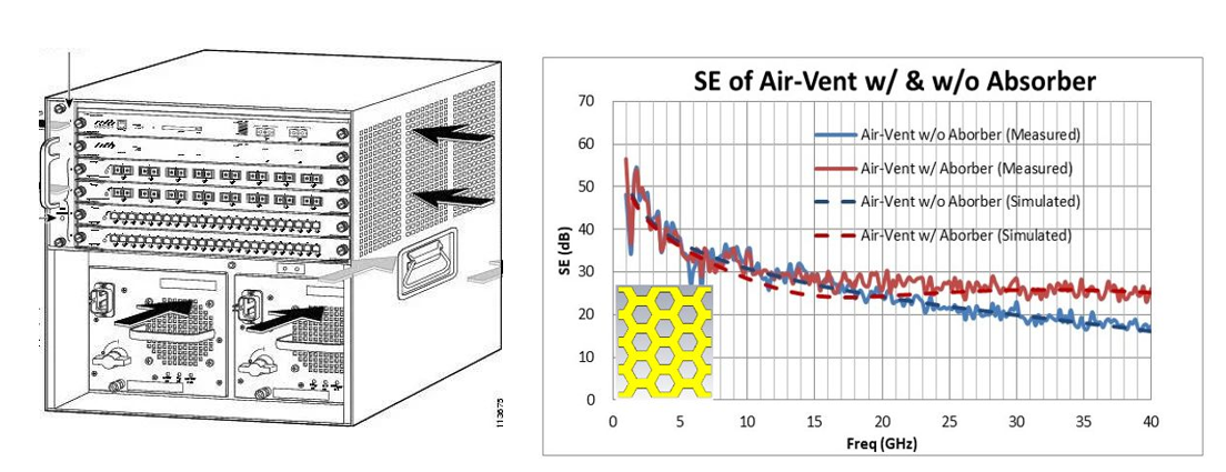 模擬主機殼通風孔Vent Hole的SE,從平面波source、TRP結果、到掃描入射角度和極化、修正參數6dB,以上方式一氣呵成,模擬結果和回聲室測試結果吻合度絕佳。
