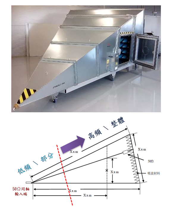 常用於抗擾度測試的GTEM室,頻率高(最高頻率到18G),尺寸大(整個房間超過400λ),在現有條件下無法直接運算。經過多方探索,現有的最佳辦法是運用半解析數值法,運用頻率外推和距離外推技術,運用低頻/部分結構的模擬結果,外推出高頻/完整結構的場值資料,和實測結果相符。