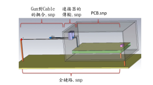 一步不行,我們就分三步走。先用HFSS模擬ESG Gun打在機殼上時對Cable的耦合,然後用HFSS模擬連接器的傳輸特性(有些廠商會提供,也可透過網分測試得到),再用SIwave模擬PCB板上輸入線對敏感線的耦合。最後把三部分的snp在AEDT裡串聯起來,就可得到全鏈路的頻率相應。這時再加一個ESD時域訊號來推動,就可以得到IC接腳上的電壓。