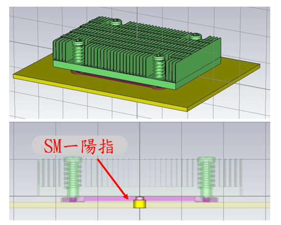 然看問題要抓重點,無論何種場型或級化,我們只需畫一個SMA同軸線,用它的核心頂住散熱器的底部,就可分析散熱器的輻射特性,還可用來最佳化主機殼佈局。最終得到的結果和實測相符。