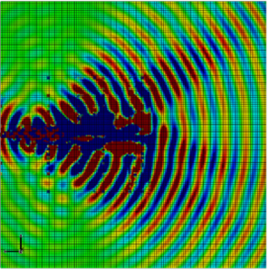 執行暫態可壓縮流體分析,並使用噪音解析工具(WAON)截取音源狀態。在暫態流體解析中,以馬赫數0.9流入,並且發生氣流變化而產生擾動。使用得到的音源執行噪音解析。執行音源檢測或是聲音的傳播狀態評估可有助於降低或控制噪音。