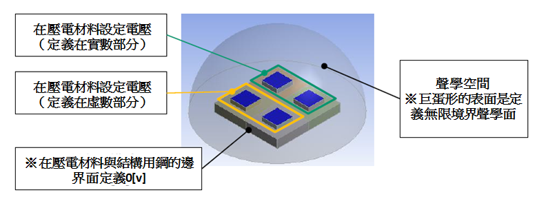 採用的是頻率響應解析,故以定義的電壓負載是計算為調和負載。在電壓負載上產生位相差,將壓電材料各分為二個,只有實際部分、只有虛的部分(位相差90度),分別輸入其值。