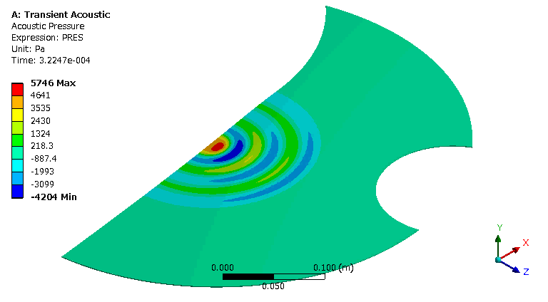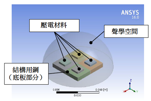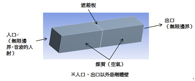 遮蔽板是一般結構元素,媒質(空氣)部分以聲響元素模型化。使用Ansys執行包含結構元素與聲響元素在內的直接耦合解析。