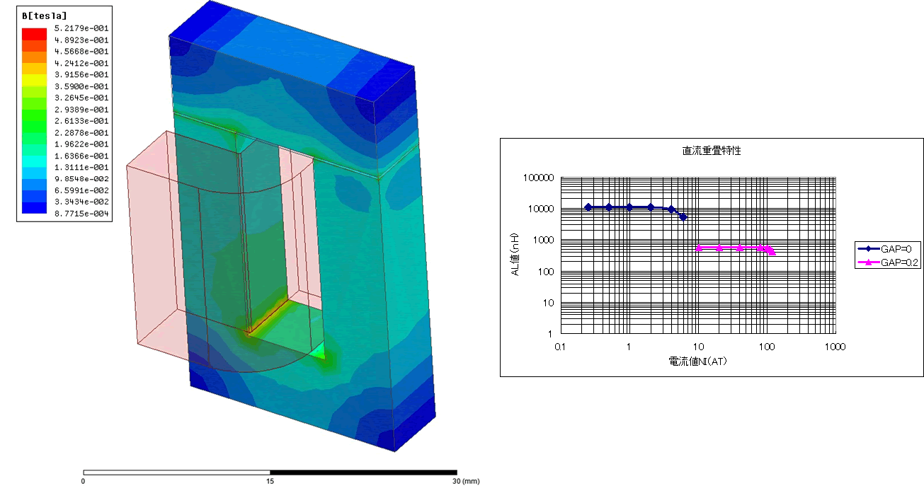 線圈流過的電流值高的話,磁性材料的磁飽和,就不能保持一定電感值。此外,可利用間隙量變化調整電感值。