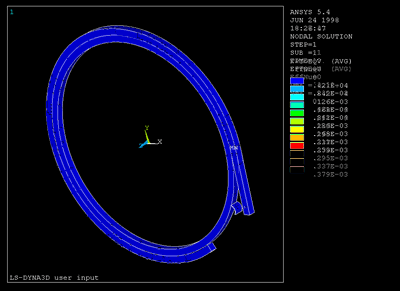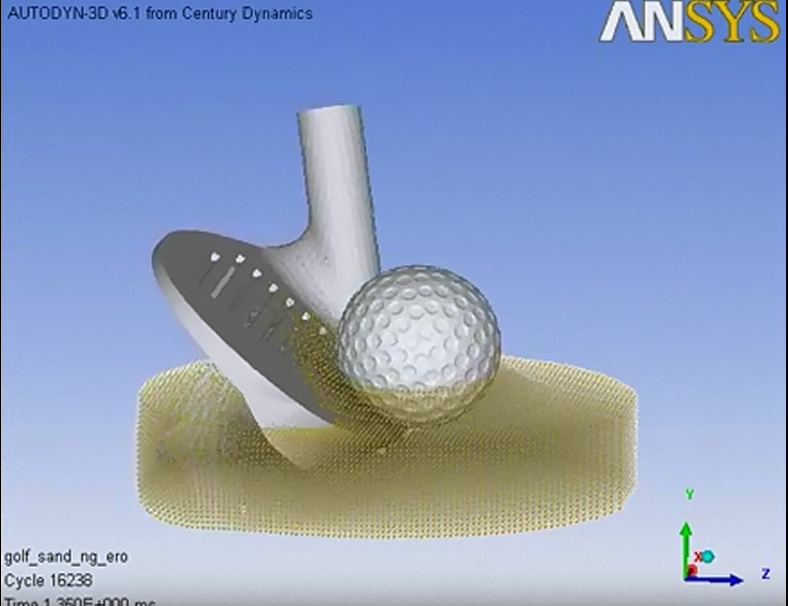 這是用Ansys Autodyn建立高爾夫沙坑擊球的分析實例。可以確認因為高爾夫球桿的衝撞造成球旋轉飛出的樣子與無網格法(SPH)模組化的砂粒飛散的樣子。