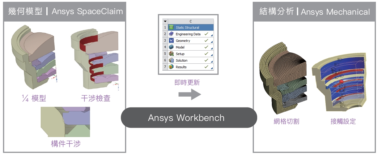 在 Ansys Workbench 平台能做到快速的建模與分析整合, 不需將幾何檔案匯出就能即時更新。利用Ansys SpaceClaim 強大的前處理技術,能簡易的完成幾何修正,消除對結構影響較小的導角及過小的面和邊,並利用切割工具將對稱的鏡頭做1/4的模型簡化,同時以干涉檢查來找出鏡片與鏡頭的干涉位置。Ansys Mechanical 是泛用型的結構分析軟體,可提供有效的幾何接觸設定,將干涉部位做自動排開並考慮進應力分析中,提供使用者評估組裝過程中機構干涉所帶來的組裝預應力。