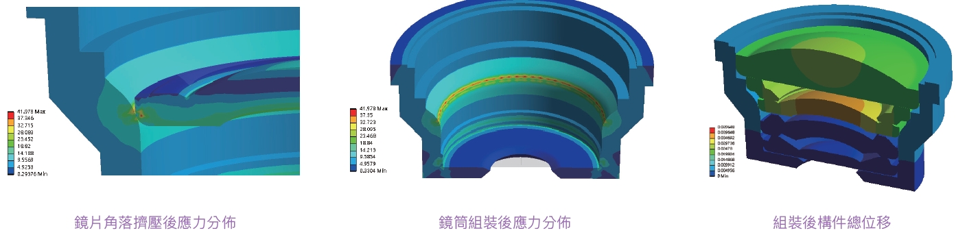 鏡頭組裝時,鏡片與鏡筒的機構干涉是不可避免的問題,然而筒身和鏡片的變形都會影響後續的防水和光學效果,再加上樣機的實測成本昂貴,也難以抓出失效位置。因此若能在設計初期,利用模擬來評估鏡頭組裝時所帶來的形變和應力集中情形,將能輔助設計者對組裝過程有更進一步的了解。