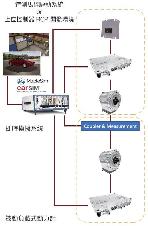 本測試平台針對馬達驅控系統大功率測試需求,提供一個能夠模擬真實負載狀況的 PHIL 測試環境。透過平台內的物理模型建模能力、即時模擬系統、被動負載式動力系統、以及動畫顯示模組,能夠以最接近真實的狀況對馬達驅控系統進行功率等級的虛擬測試驗證。