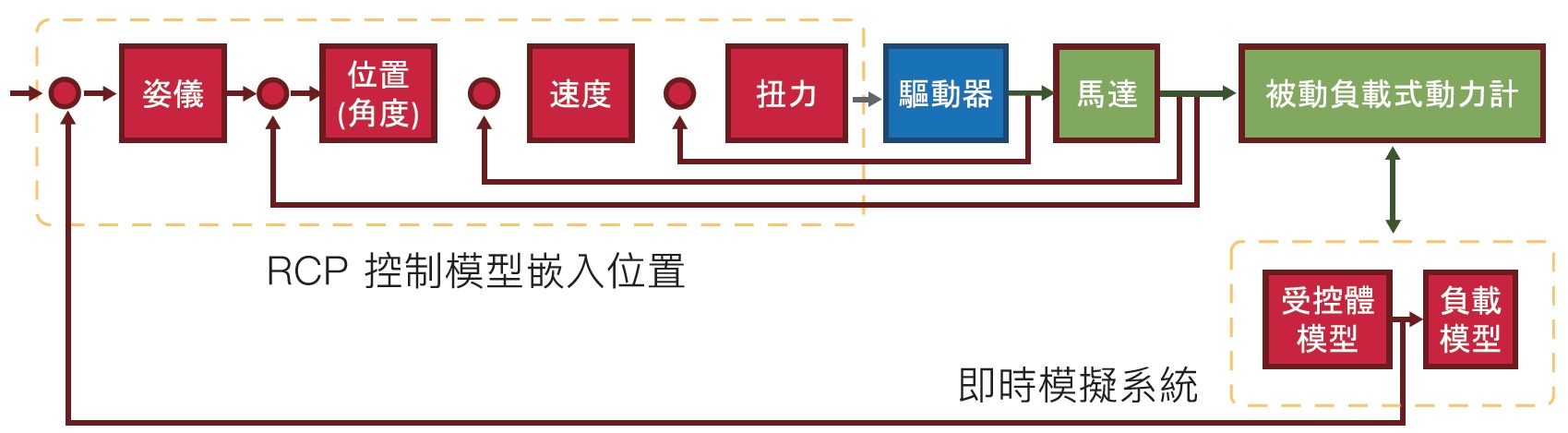 此外,本平台具備可選配的 Simulink RCP 開發環境, 使用者可根據需求於下圖紅色方框位置嵌入Simulink 控制器或是負載模型,進行扭力、轉速、位置(角度)、與系統姿儀控制等四種閉迴路控制模型的功能測試。