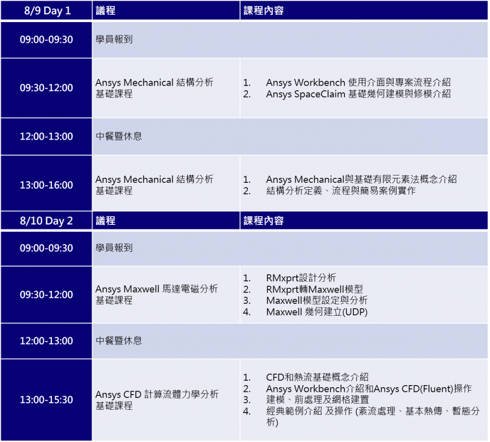 兩天課程涵蓋結構分析、馬達設計以及散熱系統設計