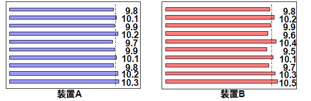 先說評估偏差的原因,比如說分別用裝置 A,裝置 B 所生產的零件長度的偏差以下圖來表示: