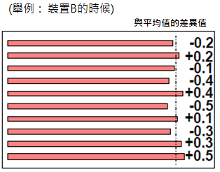 以這個公式計算出的偏差是,裝置 A 為 0.38 、裝置 B 為 1.10 ,可由數值得知裝置 B 的偏差較大。
