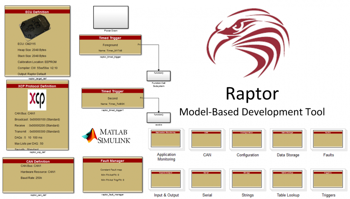 Raptor是針對Simulink使用者設計的ECU控制開發套件,其完全相容於Simulink開發環境中。透過Raptor-Dev,使用者能夠很輕易的操作並控制所有與Raptor相容的ECU硬體模組,實現包含I/O及通訊控制、OBD、中斷觸發等等各種底層的硬體操作與控制行為,讓使用者能更專注在Simulink控制邏輯與策略的開發工作上。