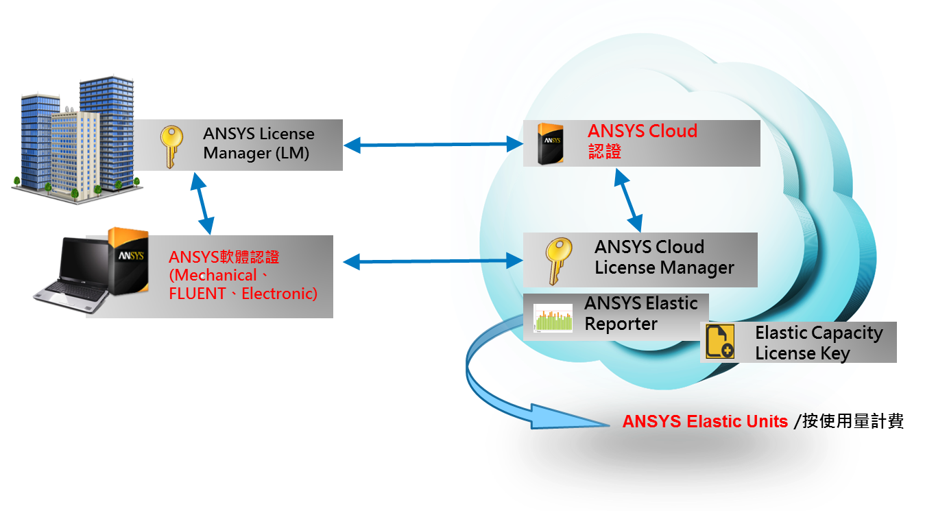 Ansys Cloud為獨立於Ansys分析架構之外的系統,使用者須擁有至少一個Ansys Electronic、Fluent或Mechanical的認證才能購買Ansys Cloud的使用認證,並再添購一定數量的Ansys Elastic Units方能使用Ansys Cloud。