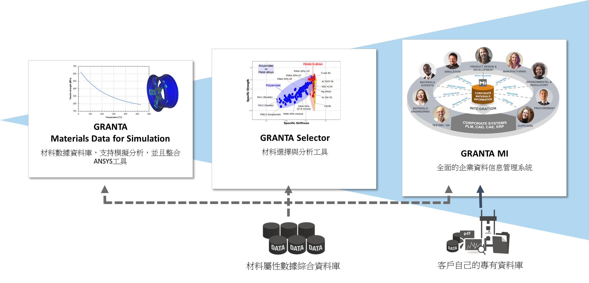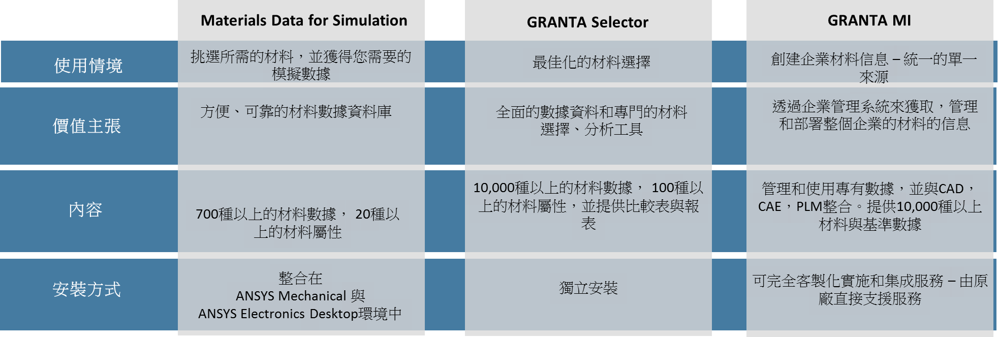 Ansys Granta 工具包分為三個主要產品,每一個別產品皆在幫助設計者以更智能、方便的方式選擇材料,同時可以完成各種不同的分析任務: