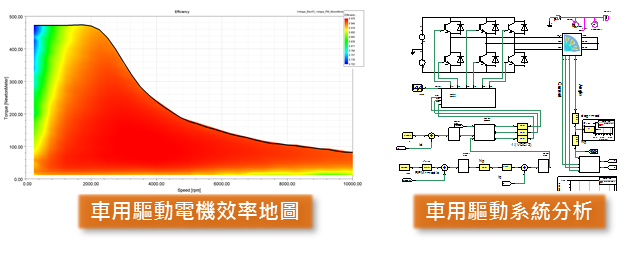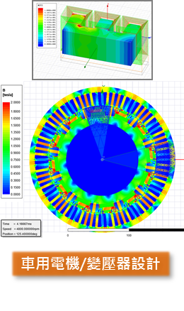 Ansys Maxwell 可以進行各式電機/變壓器的設計分析。設計上可先使用 Ansys Maxwell 中的 RMxprt/PExprt 進行快速電機/變壓器特性分析,並將 RMxprt/PExprt 模型自動建成 Ansys Maxwell 分析模型,並進行效率地圖模擬。此外,更可整合其中的Simplorer平台進行電機/電源驅動系統分析。
