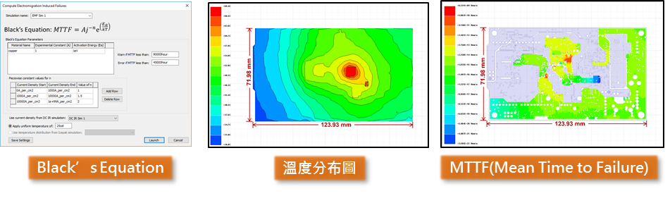 | 利用Ansys Electronics Enterprise中的Ansys SIwave及Ansys Icepak完成雙向電熱耦合模擬後,可進一步計算溫度以及電磁損耗造成的電遷移特性。透過Black’s Equation預測平均失效時間(MTTF),顯示出問題區域並加以改善優化。 | |