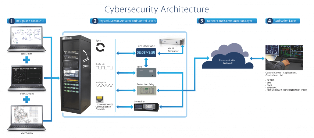即時模擬可作為一種強大有效的測試工具,在可控制的環境中模擬真實的網路攻擊和系統故障。OPAL-RT 的模擬器可提供一種有效途徑來即時同步測試大量緊急情況。針對電網安全這一應用,OPAL-RT 將通訊網路和一系列模擬的通訊協定結合在一起,從而有效重現通訊故障或網路攻擊,同時研究其對電網的衝擊。