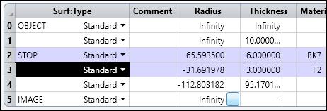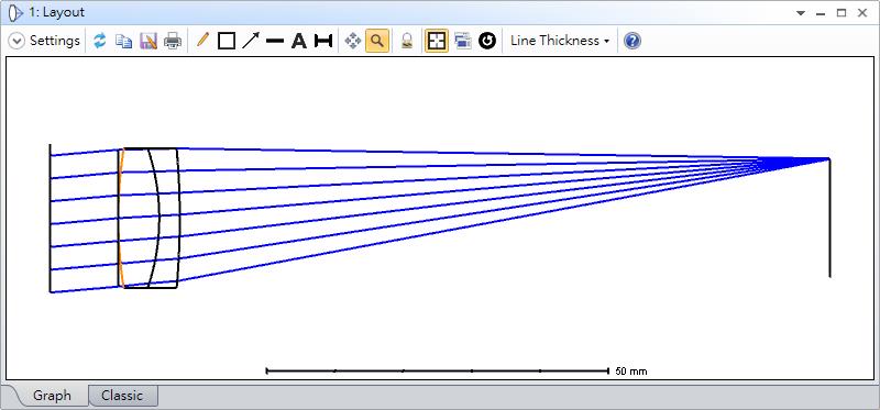 如下圖所示,以基於5度視場的雙膠合透鏡為例,採用對比度優化方法,對 20 cycles/mm 的 MTF 優化,從而優化雙膠合透鏡曲率半徑。