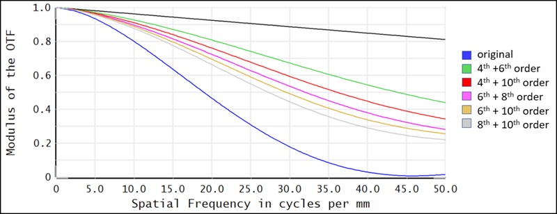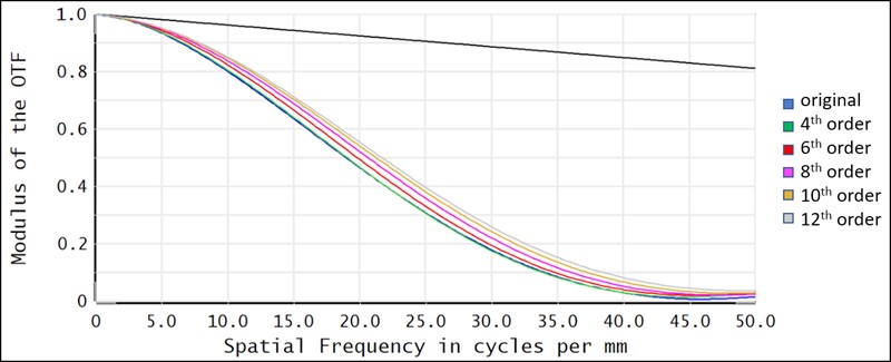 為了提升子午方向的 MTF,我們可以將雙膠合透鏡的第一個面變為非球面,然後通過加入一個單一的非球面係數作為變數來優化這個新系統。下圖顯示了在優化過程中使用不同階係數時得到的 MTF。黑色曲線為衍射極限 MTF。