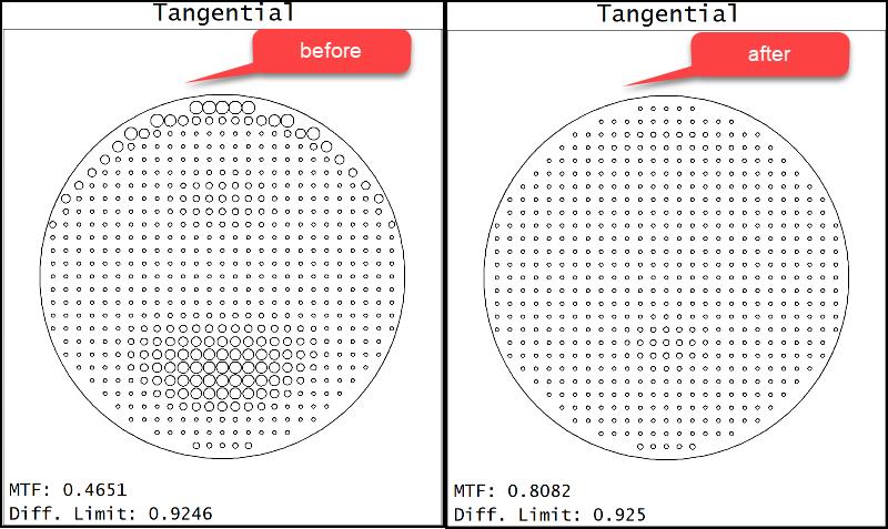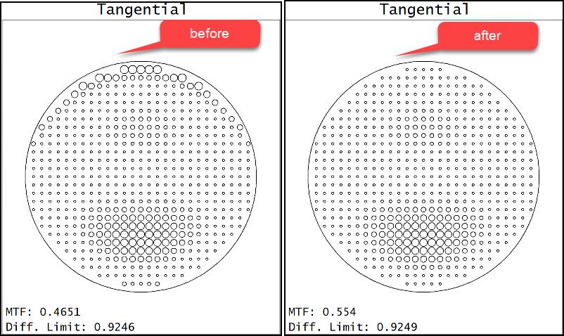 如下圖所示,對比對 12 階非球面係數優化前後的對比度損失圖,可以清楚地看出,光瞳邊緣處的對比度損失被消除了,從而讓 MTF 有了小幅提升。然而,表面邊緣的變化對子午向的對比度損失圖並沒有非常顯著的影響。