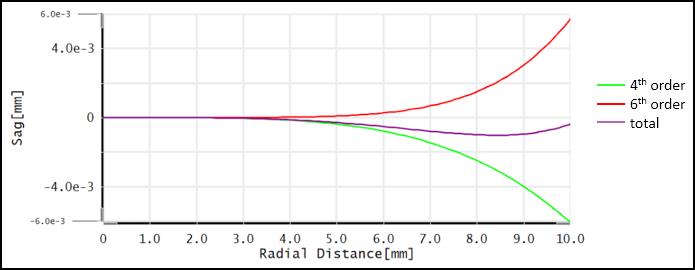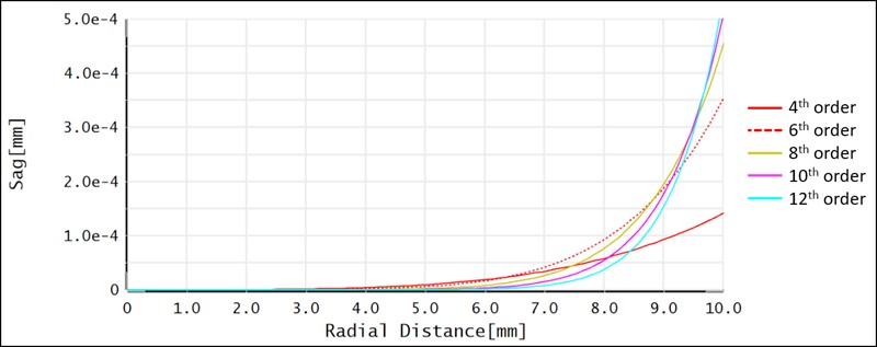 結果表明,MTF 在每種情況下都只是略有改進。為了理解這是為什麼,你可以分析每個優化後表面的矢高。在本例 中,使用單一係數優化僅僅會顯著改變透鏡邊緣附近的表面矢高。如下圖所示,12階非球面係數對非球面邊緣處的矢高影響最大,同時能夠獲得最大的 MTF 值。