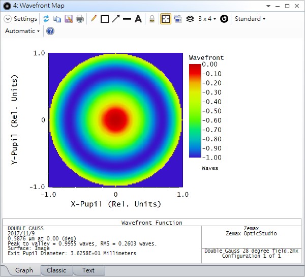 相位 φ(x, y) 被稱作波前。在 OpticStudio 中可查看波前,點擊分析 > 波前圖 > 波前圖。
