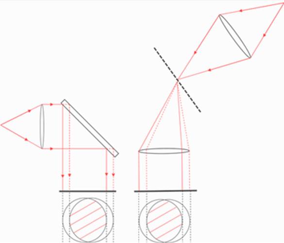 由於對比度損失是基於相位差的余弦值,當採用高採樣時,對比度損失圖能夠模擬剪切干涉圖。剪切干涉儀將測試光線一分為二,並將產生的光束以相同的方向傳播,但是兩個波面彼此橫向錯開。下圖展示了兩個示意圖。左邊的示意圖為使用平板玻璃分裂測試光束;右邊的示意圖為使用衍射光柵分裂測試光束。剪切干涉圖就是在探測器上兩束光的干涉圖樣。