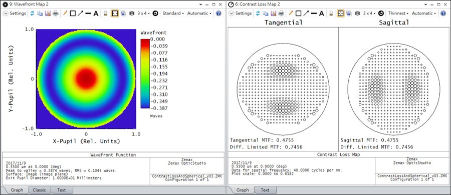 由於對比度損失圖在計算過程中使用了光瞳函數的偏移量,所以可以將其結果與真實的剪切干涉圖測量聯繫起來。例如,在以下系統中,波前圖顯示有明顯的球差。同一系統的對比度損失圖顯示為典型的包含球差的剪切干涉圖。