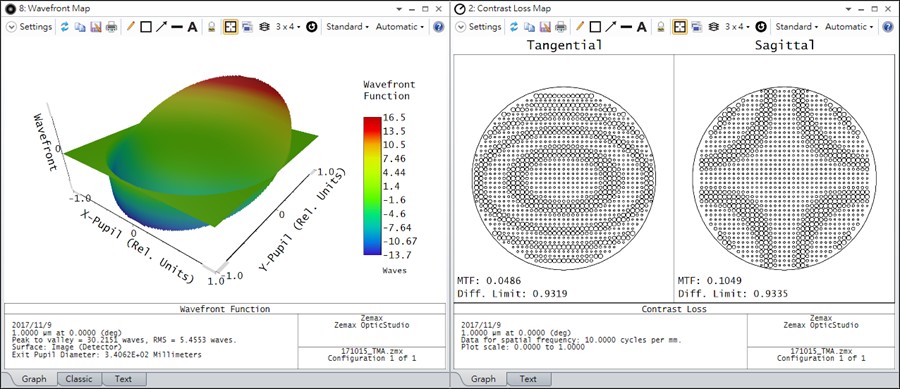 對比度損失圖表明在光瞳座標下,基於特定視場以及波長的光束,若對比度小於1,則 MTF 小於衍射極限 MTF。