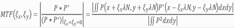 對於特定的視場和波長,可以通過對在 ξx=ξy=0 處歸一化的光瞳函數 P(x,y) 進行自相關計算之後取模來計算 MTF,ξx 和 ξy 分別是在 x 和 y 方向上的空間頻率。也就是說,MTF 可被表徵為空間頻率的函數: