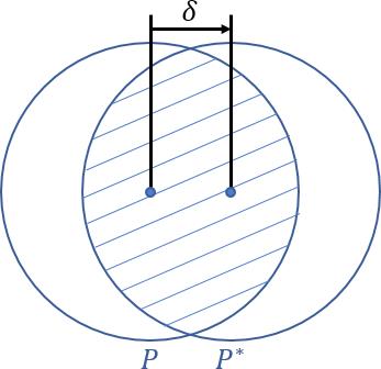 既然 MTF 是由光瞳函數的自相關計算所得,那麼光瞳函數 P 與平移後的光瞳函數 P* 的相交區域中的兩點相乘應該等價于在原光瞳函數 P 中間隔為 δ 的兩點相乘。