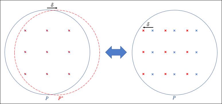下圖為光瞳函數 P 在 x 方向上平移了 δ。