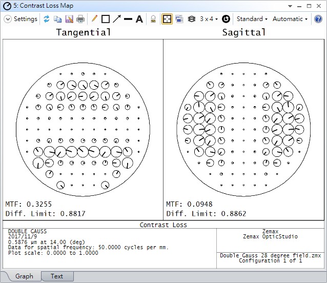 對比度損失圖是 OpticStudio 中的一個功能,旨在便於使用者理解光學系統中對比度的變化或損失。它將特定頻率的調製傳遞函數(MTF)的對比度損失在光瞳上以作圖形式視覺化。