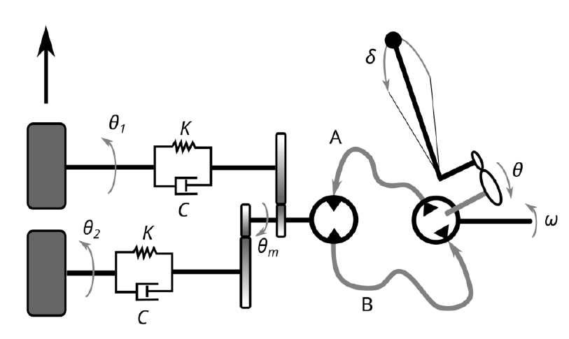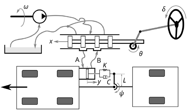 Hydrostatic articulation: 利用車勾關節機構(Hitch articulation)與閥體控制線性作動器(Valve-Controlled linear actuator)控制轉向力矩。