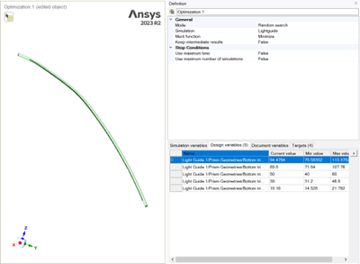 在2023R2中有兩種可供選擇的方法來執行此類分析。第一個嵌入到Ansys Speos中的優化,允許基於隨機演算法Random search設置一個優化,以研究不同參數集對模擬結果的影響。