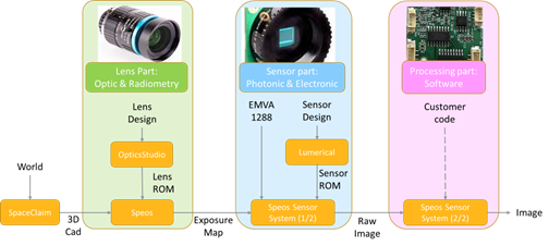 隨著camera系統的普及集成在更多的設備中,在新的市場中集成更複雜的功能,虛擬驗證是縮短和提高整體開發週期的關鍵。由於Speos camera感測器允許對場景進行採集,考慮到照明條件,動態…,Speos感測器系統(SSS)基於EMVA 1288標準,用於對模擬結果進行後期處理:將接收到的能量轉換成光子圖,光子圖轉換成電子圖,將電子圖數位化,生成一張原始圖像,進一步處理原始圖像,得到最終圖像,Ansys Lumerical FDTD和Ansys Lumerical CHARGE的輸入在不同步驟計算中提供了更高的準確性。