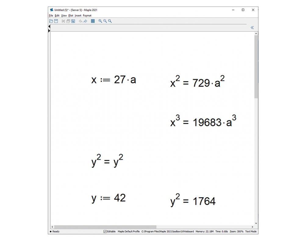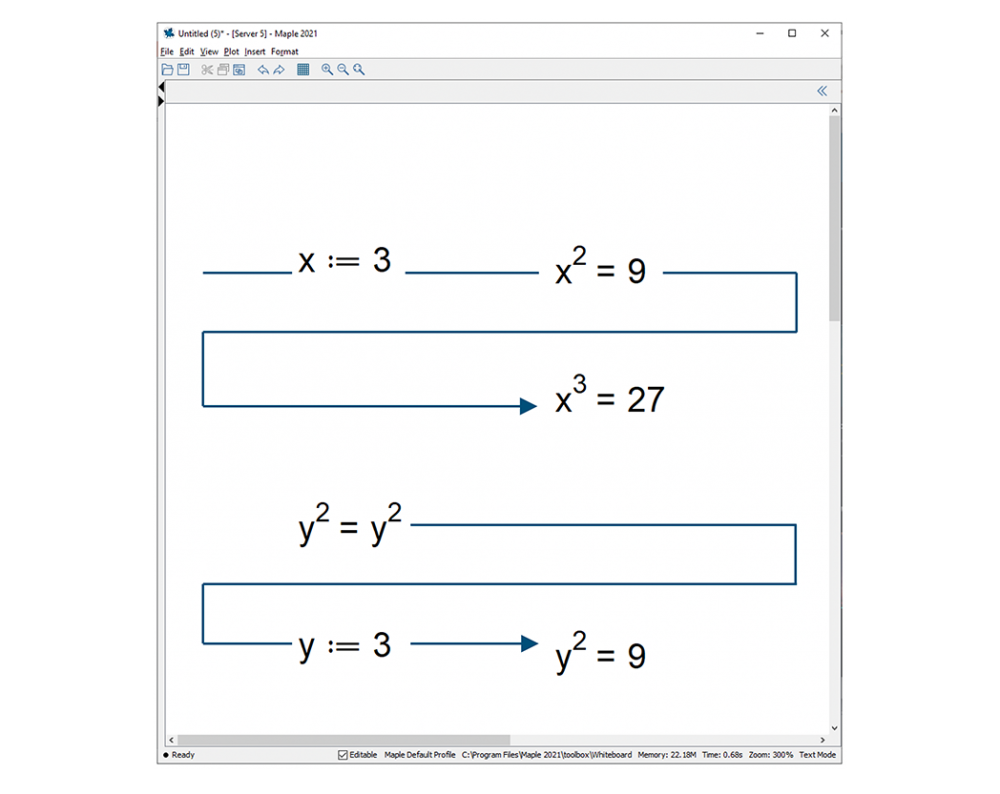 | 在計算白板的任何地方放置數學、文本、繪圖和圖像。輕鬆移動元素的位置或重新組織它們。 | Maple Flow 依據從左至右、從上至下的順序讀取和執行數學計算。 |