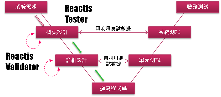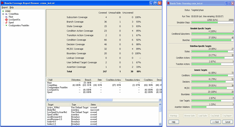 基於模型的設計過程中,模型的測試和驗證至關重要,Reactis,是業界領先的軟 體測試與驗證工具,支援Simulink/Stateflow和 TargetLink 模型的測試和驗證,2007年還發佈了Reactis for C Plugin,提供模型中C程式碼部分(包括S函數和State-flow中的C程式碼)的白箱(WhiteBox)分析功能。