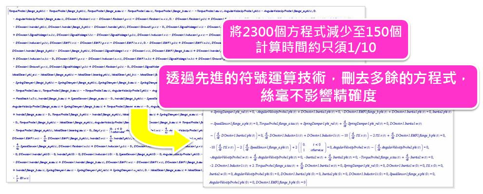 以先進的符號運算技術自動簡化複雜的模型 MapleSim會自動簡化您的方程式,使得運算及模擬速度提昇數十倍以上,並且毫不影響模擬結果。