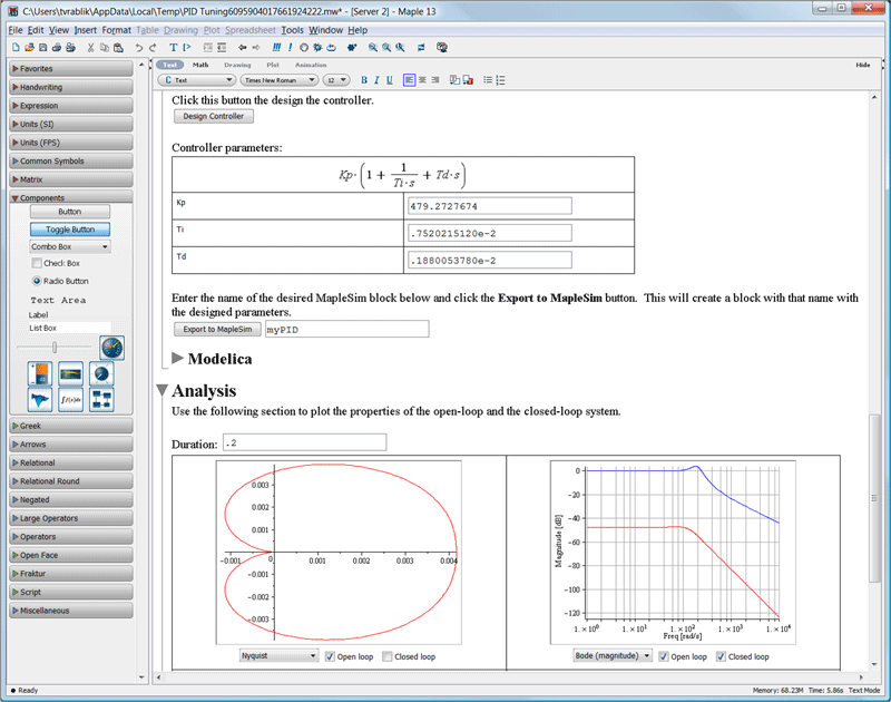 - 增加控制器設計的重複使用性:使用 MapleSim 延伸功能的技術文件工具,讓您可以文件化您的設計結果。