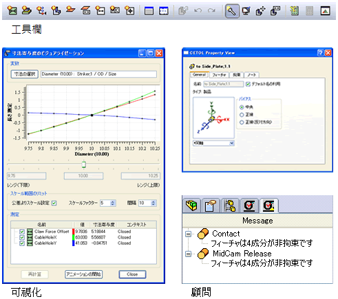 使用 CETOL 6σ 進行公差分析時所輸入的公差資訊和組裝順序的定義,可以直接對3次元 CAD 數據進行定義。直接利用設計工作中所創建的3次元 CAD 數據,從而提供現設計者在擴展 CAD 操作時也參與公差分析的環境。