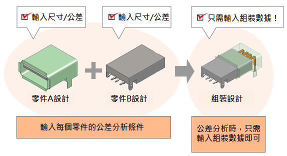 CETOL 6σ 所設定的數值全部添加到3次元 CAD 數據。零件相關的信息加入到零件數據裡,組裝相關的數值加入到組裝數據庫裡保存。只要在設計各階段輸入必要的數據,在裝配驗證時,就可以用必要最低限的操作得出公差分析結果。另外,由於已將公差分析值全都添加到 CAD 數據裡了,所以無需分別管理 CAD 數據和公差分析數據的信息,以幫助設計信息的集中管理。